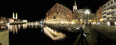 Blick Flussabwärts (Limmat) von Quaibrücke zum Bauschänzli (Zirkus Conelli) bis zm Hotel Storchen und Kirche Grossmünster